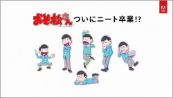 アドビシステムズ株式会社の学割セール宣伝担当に期間限定で就任した、大人気TVアニメ『おそ松さん』の主役の松野家の6つ子たち。Twitter限定のムービー第1話には自称「兄弟一まとも」な松野家三男のチョロ松(CV:神谷浩史)が登場し、バッチリ宣伝を行った。