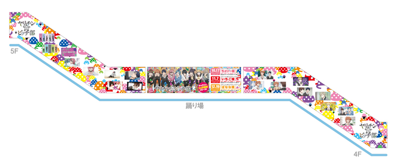 また、10月10日(水)より、アニメイト池袋本店4F~5F階段壁面部分をヤリ部がジャック。アニメ場面写真や、キャラクターソングのキャラ別イラストが並ぶ。