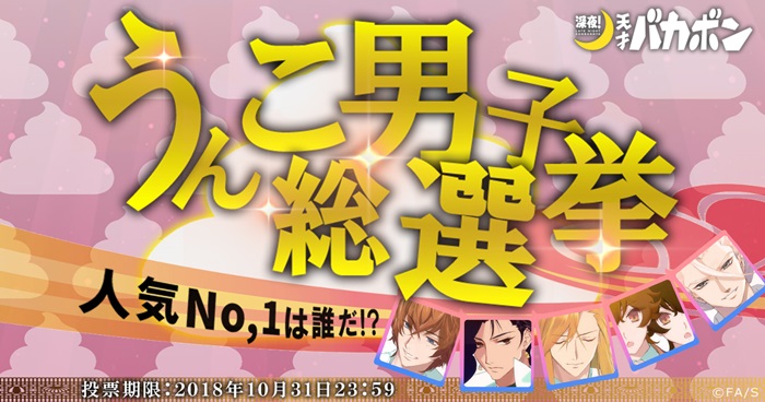 それを記念して、『深夜!天才バカボン』公式ツイッターでは、“人気No.1“のうんこ男子を決める『うんこ男子総選挙』を開催。本企画の投票期間は、10月23日(火)18時~10月31日(水)23:59までとなっており、見事No.1に選ばれた“うんこ男子”は、デジタルコンテンツ(待ち受け画像)として配布される予定とのこと。