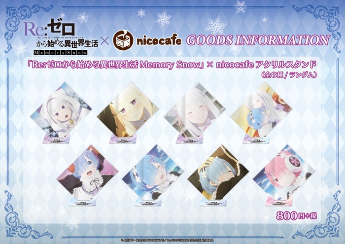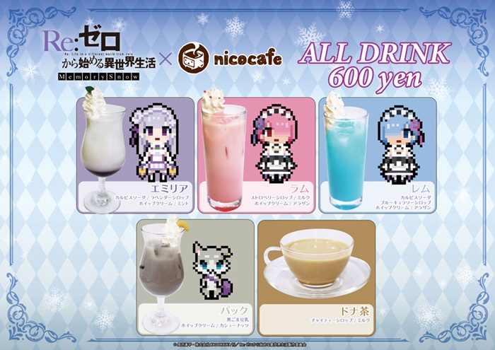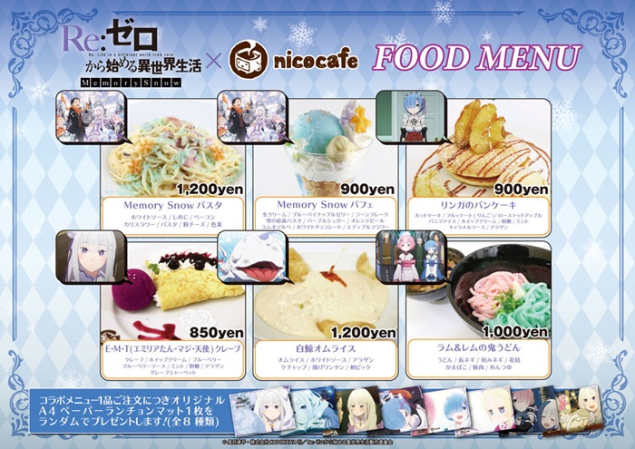 nicocafeとのコラボでは、『Re:ゼロから始める異世界生活 Memory Snow』をイメージしたメニューのほか、2016年に開催されたメニューの一部も復刻。さらに、限定ノベルティやグッズの販売も予定されている。