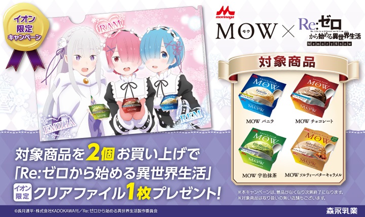 『MOW』とのコラボキャンペーンでは、対象商品を2個購入すると、『Re:ゼロから始める異世界生活 Memory Snow』オリジナル描き下ろしA4クリアファイル(全1種)が1つもらえる。