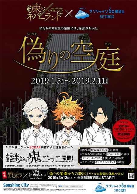 株式会社SCRAPが手がける“リアル脱出ゲーム”とTVアニメ『約束のネバーランド』がコラボレーションしたイベント“偽りの楽園(ネバーランド)からの脱出”が、2019年3月より全国で順次開催されることが決定!
