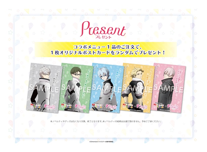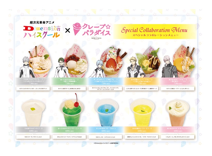 超次元革命アニメ『Dimensionハイスクール』は、アニメ・ゲームをテーマにした新感覚のクレープ店『クレープ☆パラダイス』との期間限定コラボレーションを実施。メインキャラクター5人をそれぞれイメージした、おいしさ超次元級のコラボクレープ&ドリンクメニューが、1月30日(水)より登場。オーダー1点につき、ここでしか手に入らない限定オリジナルポストカード1枚が手に入る。