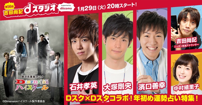 超次元革命アニメ『Dimensionハイスクール』を代表して、白山純平役の石井孝英さんと緑ヶ丘流星役の大塚剛央さんのゲスト出演が決定。さらに、2019年の運勢を占ってくれるのは、人気タロット占い師の濱口善幸さん。兄である“よゐこ”濱口 優さんも認める実力でこれまでに2万人を鑑定してきた凄腕占い師が生放送でズバッと占う! ゲスト&MC陣の2019年の運勢は!?