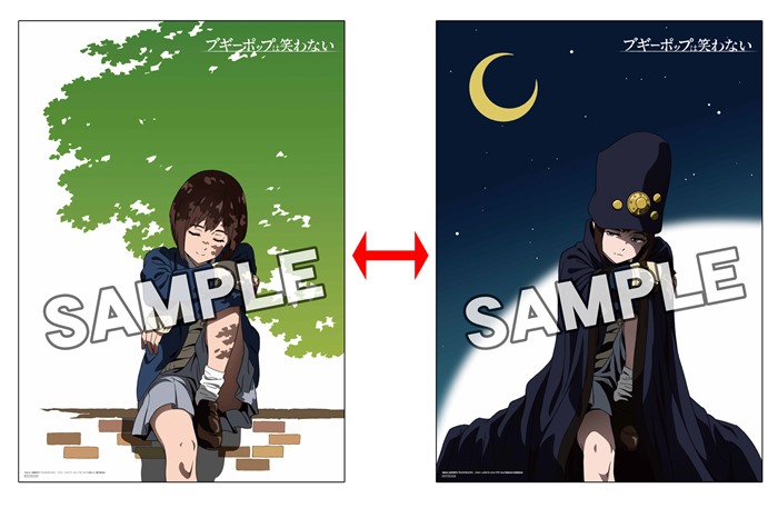 TVアニメ『ブギーポップは笑わない』Blu-ray&DVD第1巻を下記対象店舗にて予約すると、先着でアニメ描き下ろしイラストを使用したA3チェンジングポスターが発売日にもらえる。ポスターを見る角度を変えると絵柄が宮下藤花からブギーポップにチェンジ!?