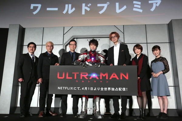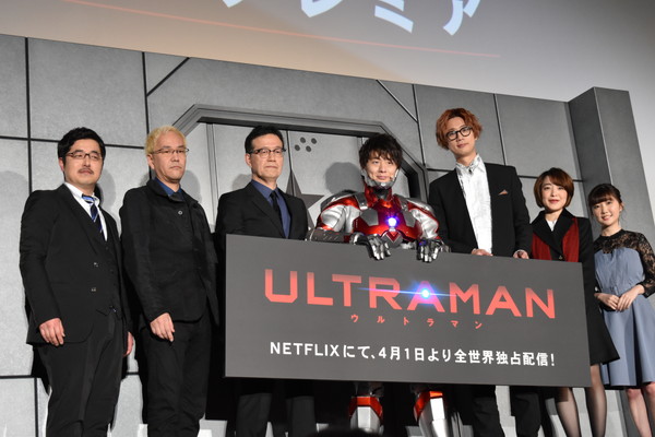 4月1日からのアニメ『ULTRAMAN』Netflix世界同時独占配信に先駆け、本日3月31日に丸の内ピカデリーにてワールドプレミアが開催された。本イベントには木村良平さん(早田進次郎 役)、江口拓也さん(諸星弾 役)、潘めぐみさん(北斗星司役)、諸星すみれさん(佐山レナ役)という主要キャラクターを演じる人気声優陣に加え、神山健治・荒牧伸志両監督が登壇した。さらに、木村良平さんがULTRAMAN SUITでサプライズ登場するなど会場を盛り上げた。