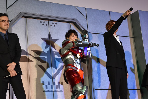 そしてここまできて、主役の木村良平の姿が見えないことに少しざわつき始めると、MCが「みなさん、そわそわしていますが大丈夫です、会場に来てくれていますから!」とあおり、場内から拍手と歓声があがる中、アニメ本編内にも登場する「科学特捜隊」基地を思わせる舞台上の扉から木村が登場。そこには、ULTRAMANスーツ姿を来た木村の姿があり、登場するやこの日一番の歓声が沸き起こった。