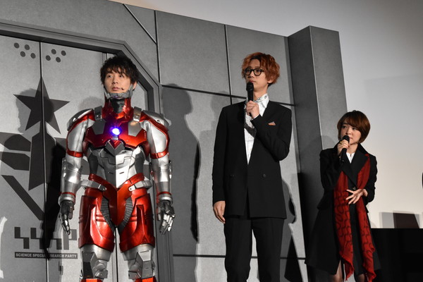 続いて、江口拓也・潘めぐみ・諸星すみれのキャスト陣が紹介されると、客席の通路を通って登場。人気声優たちが間近で見れるとあって場内ではひときわ大きな歓声があがり、キャストたちも笑顔で応えていた。演じたキャストたちからは、「まさに今、ご覧いただけたのですよね、早く続きを観てもらいたいです」(江口)、「感無量です。大好きなULTRAMANを明日から皆さんにみていただけるなんて、気持ちがはやっています」(潘)「今日のお披露目、嬉しいです。仕上がりのクオリティが高くて、大きいスクリーンで見れた皆さんがうらやましいです」(諸星)と、それぞれ今日のプレミアを迎えられた喜びの表情を浮かべていた。