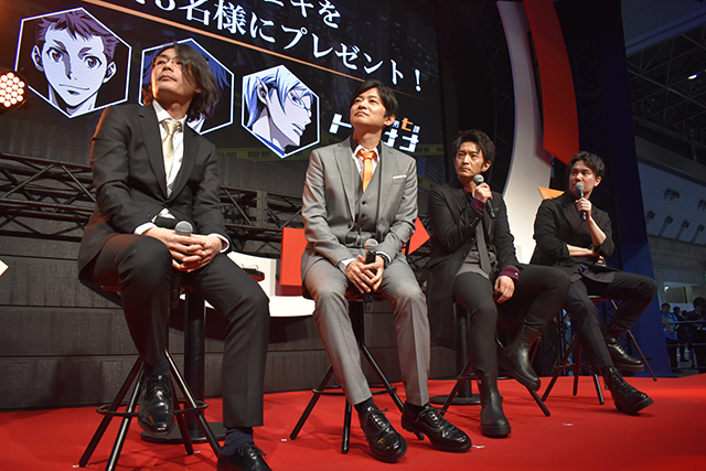 ステージには、七月清司役の下野紘さん、一ノ瀬栞役の津田健次郎さん、二条クジャク役の鈴木達央さん、総監督の栗山貴行さんが登壇し、TVアニメのみどころから、キャラクターの魅力についてのお話し、さらに直筆のサイン入りチェキが当たる抽選会を実施。最後には作品を楽しみにしている方々へのメッセージなどを熱く語ってくれた。