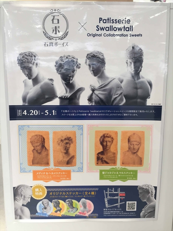 新宿マルイアネックスにて、「ホルべイン芸能 新宿マルイアネックス支社」が、2016年5月1日(日)まで開催中だ。支社では、彼らのアイドルグッズ、BD&DVDの販売をはじめ、アニメの絵コンテ、原画といった貴重な展示が行われている。もちろん、聖ジョルジョたち石膏ボーイズ4人の姿も…!!