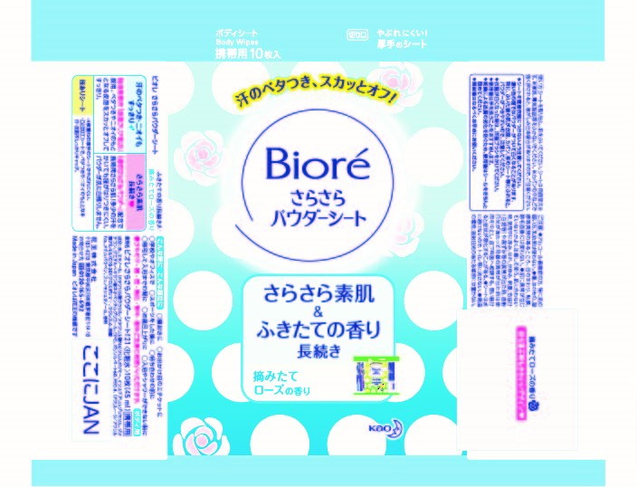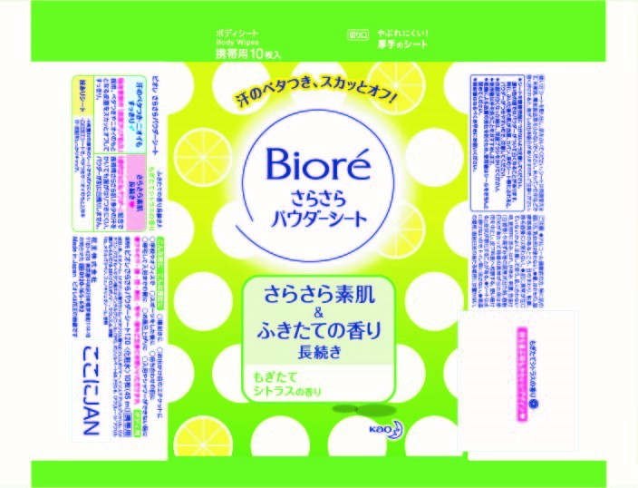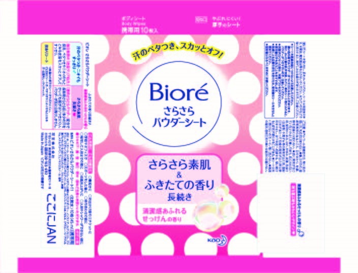 さらさら素肌&ふきたての香り長続き。独自開発の“皮脂クリア処方”採用。ベタつきやニオ イのもととなる皮脂をスカッとオフしてすっきり。“透明さらさらパウダー”配合で長時間さらさら肌! 多少の汗をかいても服がはりつきにくい。パウダーが肌に白残りしない。4枚重ねの厚手のシートでやぶれにくい。凸凹加工シートで、ベタつきやニオイのもととなる汗 ・皮脂をしっかりキャッチ。