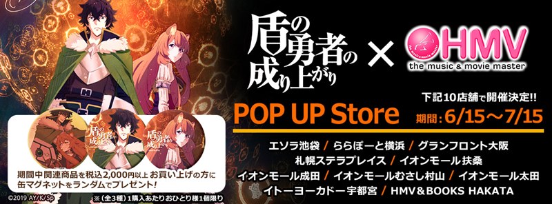 6月15日よりHMV10店舗にて『盾の勇者の成り上がり』×HMV POP UP Storeが開催。オリジナルグッズの販売、ノベルティプレゼントなどが実施される。