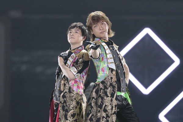 ŹOOĻの去ったステージに登場したのは、そんな彼らとも因縁が深いTRIGGER。十龍之介役の佐藤拓也さんがたった一人で「願いはShine On The Sea」を歌い始める演出は、作中での出来事を思い起こさせ、誰もが胸を締め付けられる。九条天役の斉藤壮馬さん、八乙女楽役の羽多野渉さんの歌声が聴こえるまで、客席は固唾を飲んでステージを見守っていた。MCでは、この歌を3人で歌える日を心待ちにしていたという佐藤さんが、感極まって涙を流す一幕も。その後は、デビュー曲である「DIAMOND FUSION」を一糸乱れぬダンスと共に歌い上げ、続く「In the meantime」を伸びやかに歌い切り、TRIGGERの様々な表情を見せた。