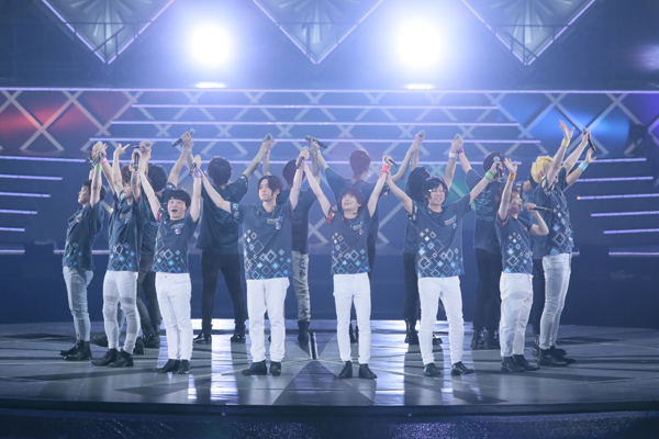 その後、アンコールの声に応え、IDOLiSH7、TRIGGER、Re:valeの3グループが颯爽と登場。ライブTシャツをラフに着こなし、観客に感謝を伝える。その流れで再びトロッコに乗り込むと、「Wonderful Octave」、「PARTY TIME TOGETHER」を2曲続けて熱唱した。3グループのメンバーたちの呼び込みで、ŹOOĻも合流し、16人が再び集結。ここで更なる重大発表が。なんと、アニメ2期のティザービジュアルと放送情報が初解禁。喜びと興奮で会場がどよめく中、メンバーも口々に喜びを語り合う。ライブの最後を締めくくったのは、PSVita『Twelve Fantasia!』に登場する、3グループ総勢12名による「Welcome, Future World!!!」。ライブではŹOOĻを含めた16名と観客が一体になるコール&レスポンスで、大成功のまま1日目の幕を閉じた。