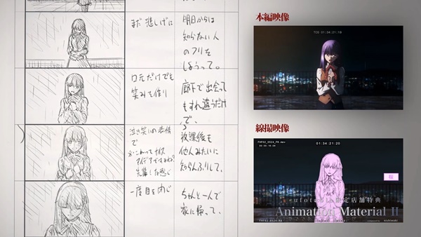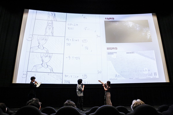 最初のシーンは、雨に打たれる衛宮士郎と間桐桜が初めて心を交わす“レイン”。ufotableの撮影監督の寺尾優一さんはこのシーンを「劇場版『Fate/stay night [Heaven’s Feel]』の象徴的シーンのひとつでもある」とコメント。今回のイベントでは須藤友徳監督による「絵コンテ」、アニメーターが描いた原画(動画)を撮影した「線撮映像」、そして仕上げ(彩色)と撮影処理を加えた「完成映像」を同時に見せる制作過程映像が披露されました。