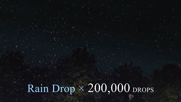 今回披露された「アニメーションマテリアルⅡ」の映像では、3DCGで描かれた雨粒もクローズアップ。ひとつのカットに、3DCGでの雨粒を近景900個、遠景200,000個降らせることで、美しく激しい雨が降り注ぐシーンができたことが明らかになりました。