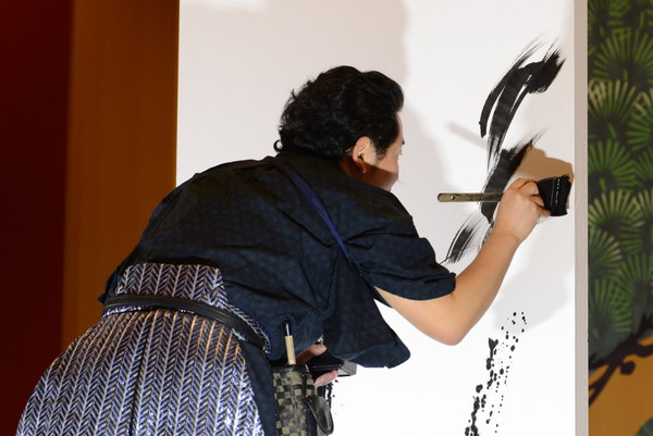 さっそく舞台上に立てられた高さ2mほどの大きな紙に向かい、腰に付けた筆入れから筆を抜き、ライブペインティングがスタート。御歌頭氏は、 太い筆でダイナミックに墨を飛ばして身体を描き出したかと思うと、細い筆で表情や髪の毛の動きを緻密に描写。複数の筆を巧みに使い分け、どんどんデクを描き上げていく。下描きをしていないにも関わらず迷いなく大胆に筆を走らせる御歌頭氏の様子に、観客も永井プロデューサーも驚きの表情を浮かべていた。