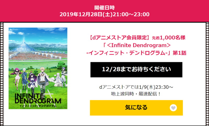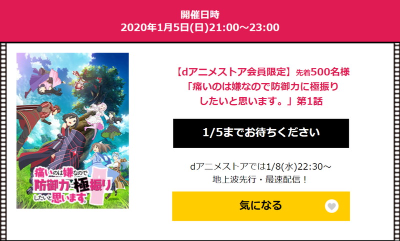 第1話を一足先に視聴できる“WEB先行上映会”に先着順で招待! dアニメストア会員なら誰でも参加OK! 各開催日時に特集ページへアクセスしよう。新番組を先取りできるチャンス! 忘れずに、上限人数に達する前に視聴しよう♪