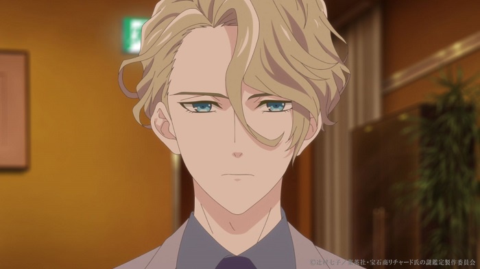 TVアニメ『宝石商リチャード氏の謎鑑定』婚約指輪の下見に来店した山本。「美人は得だ」とリチャードに挑発するようなことを言う