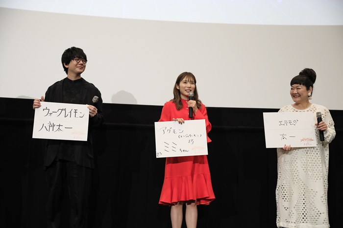 舞台挨拶には主人公・八神太一を演じた花江夏樹、太一のパートナーデジモン・アグモンを演じた坂本千夏に加え、今回の映画のゲストキャラクター・メノアを演じた松岡茉優が登壇。