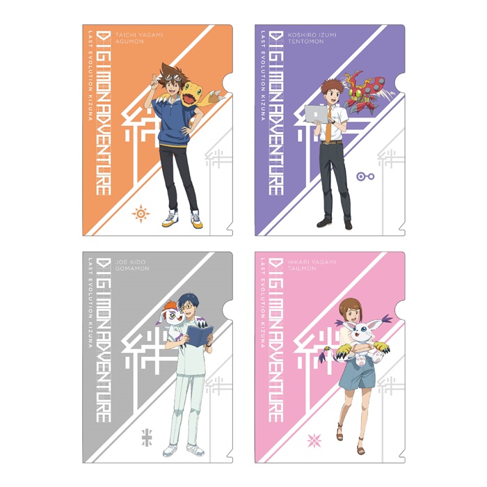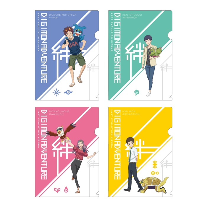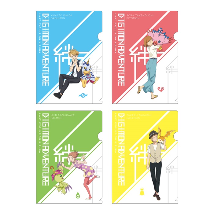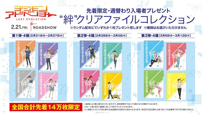 公開日から1週間ごとに4種類の中からランダムで1枚、3週連続で全12種類となる。“選ばれし子どもたち”12名とそのパートナーデジモンのペアが描かれた、ここでしか手に入れることができない貴重なクリアファイルだ。