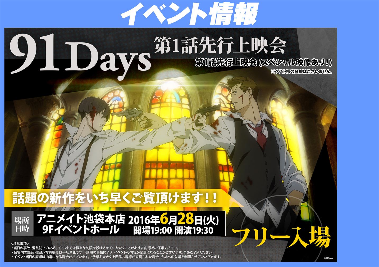 2016年7月から始まるオリジナルTVアニメ『91Days』より、90秒の本PVや第1話場面写真、パッケージ情報、配信情報、ノベライズ情報、アニメイト先行上映会情報、WEBラジオ情報など一気に解禁となった。
