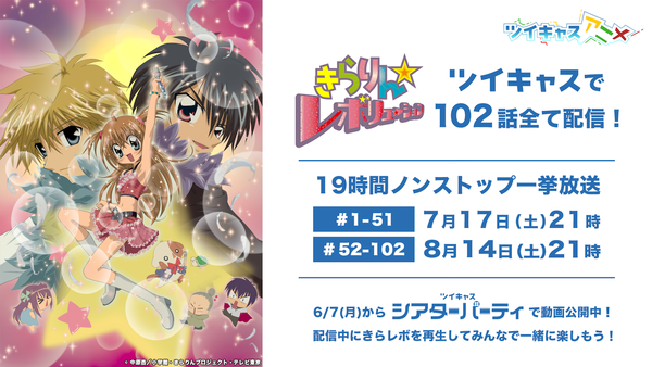 ライブ配信プラットフォーム「ツイキャス」にて、アニメ『きらりん☆レボリューション』が7月17日(土)・8月14日(土)に一挙放送される。