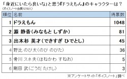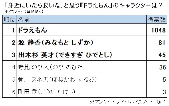 選定方法:公式サイトでキャラクター紹介されている、ドラえもん・のび太・その同級生の友人4名、計6キャラクターの中から、「身近にいたら良いな」と思うキャラ、「身近にいたら嫌だな」と思うキャラを一つ回答してもらい集計