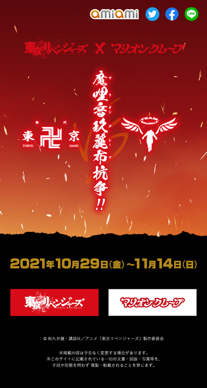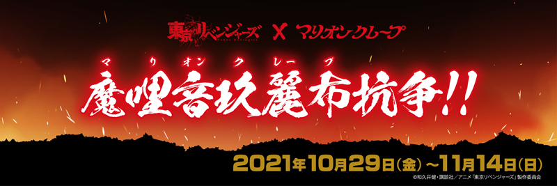 ホビー通販大手で、商品企画制作も行う「あみあみ」(大網株式会社、東京都文京区)は、TVアニメ『東京リベンジャーズ』と、人気クレープショップ『マリオンクレープ』とのコラボレーション企画「魔哩音玖麗布(マリオンクレープ)抗争」を、2021年10月29日~11月14日にかけて12都道府県35店舗で開催いたします。