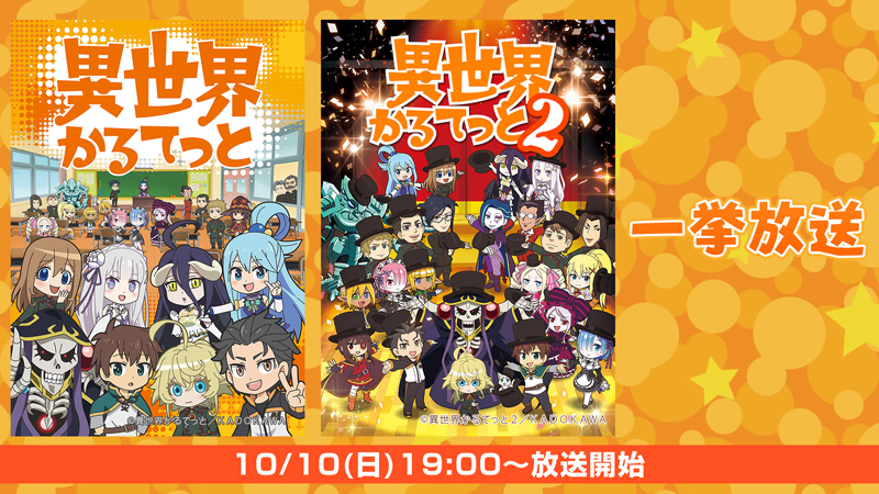 ニコニコ生放送では、10月6日~10月10日の5日間「この素晴らしい世界に祝福を!」、「幼女戦記」、「慎重勇者~この勇者が俺TUEEEくせに慎重すぎる~」、「オーバーロード」、「異世界かるてっと」、「異世界かるてっと2」計6作品の異世界系アニメ一挙放送をお送りします。