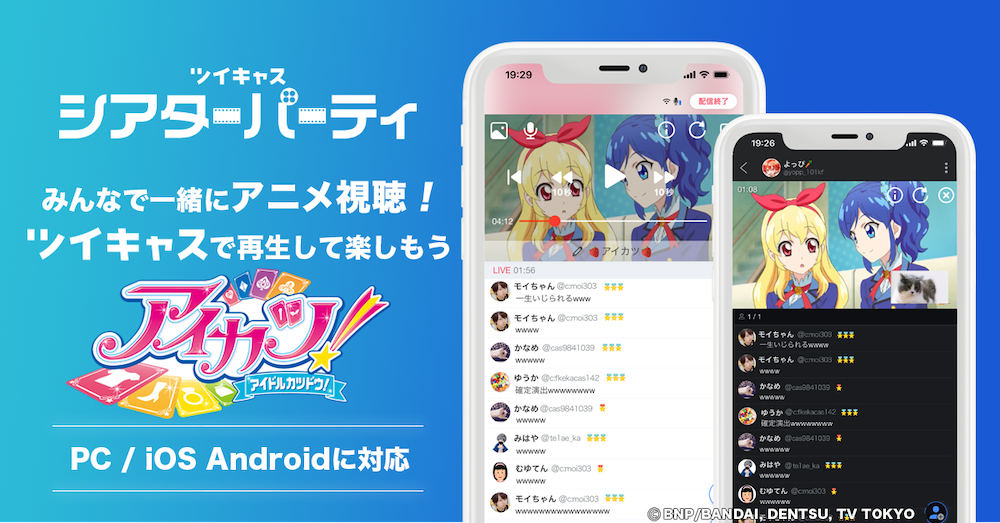 ツイキャスの「シアターパーティ」公式コンテンツに「アイカツ!」が登場。配信中に、「アイカツ!」をシアターパーティで選択すると、期間中いつでも視聴者と一緒にアニメ映像をお楽しみいただけます。