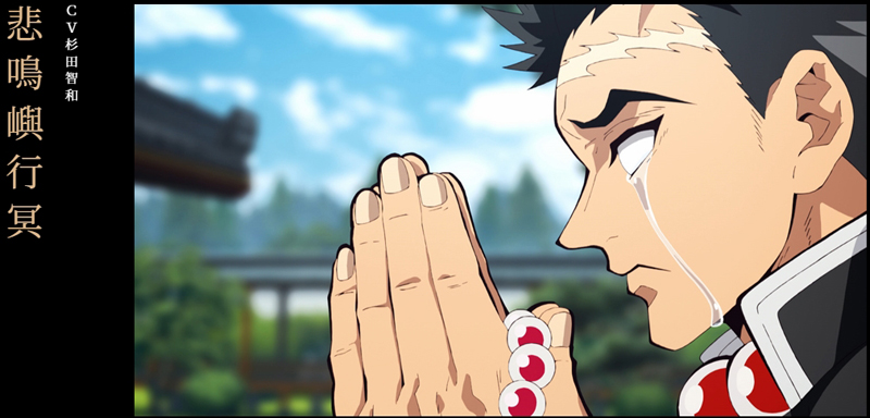 岩の呼吸を使う柱で、筋骨隆々な肉体に加えて、瞳孔のない白眼、手や首の数珠と、彼も特徴的ないでたちです。