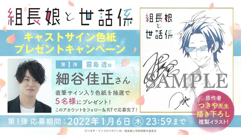 色紙は、原作者つきや先生が色紙用に描き下ろしたイラストを使用。TVアニメ「組長娘と世話係」の公式Twitterアカウントをフォローの上、該当ツイートをリツイートすることでご応募いただけます。