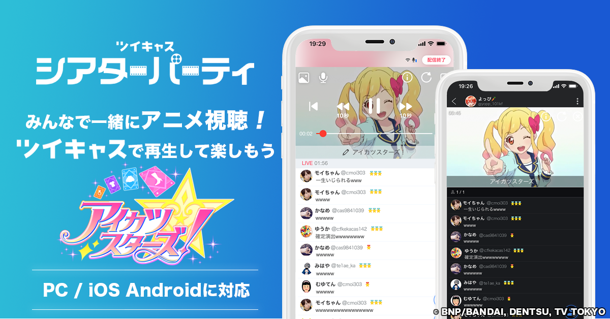 ツイキャスの“シアターパーティ”の公式コンテンツに『アイカツスターズ!』が登場。配信中に、『アイカツスターズ!』をシアターパーティで選択すると、期間中いつでも視聴者と一緒にアニメ映像をお楽しみいただけます。