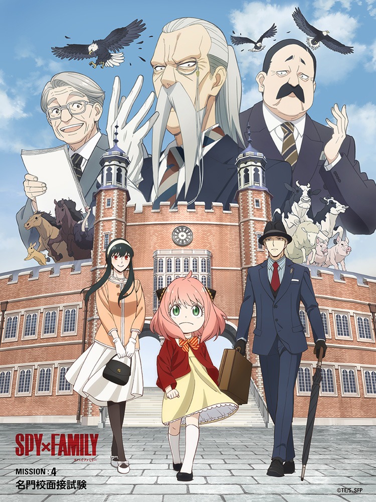 イーデン校面接試験に挑もうとするフォージャー家の3人の背後には、試験官として立ちはだかる教員、ヘンリー・ヘンダーソン、ウォルターエバンス、マードック・スワンの姿が。本編の内容そのままに、名門校に挑むフォージャー家の決意と緊張感の伝わるビジュアルになっています。
