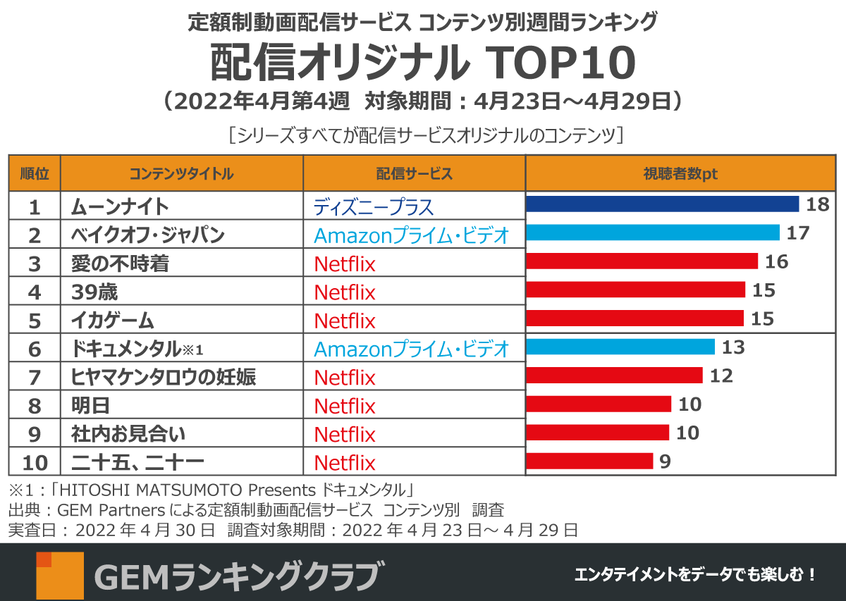 GEM Partnersは5月6日、エンタメコンテンツランキングやデータ情報を発信する“GEMランキングクラブ”プロジェクトにて作成した2022年4月第4週の“定額制動画配信サービス コンテンツ別週間ランキングTOP20(調査対象期間:4月23日~4月29日、調査対象:日本在住15~69歳男女)”を発表しました。