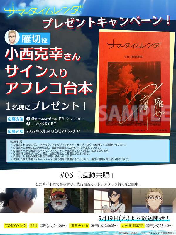 第6話“起動共鳴”の放送直前を記念して、プレゼントキャンペーンがスタート。作品公式Twitterをフォロー&キャンペーンツイートをRTしていただいた方の中から抽選で1名に“雁切真砂人役・小西克幸さんサイン入り#06 アフレコ台本”をプレゼントいたします。