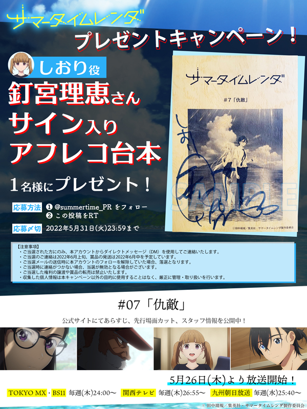 第7話“情報”の放送直前を記念して、プレゼントキャンペーンがスタート。作品公式Twitterをフォロー&キャンペーンツイートをRTしていただいた方の中から抽選で1名に“小早川しおり役・釘宮理恵さんサイン入り#07 アフレコ台本”をプレゼントいたします。