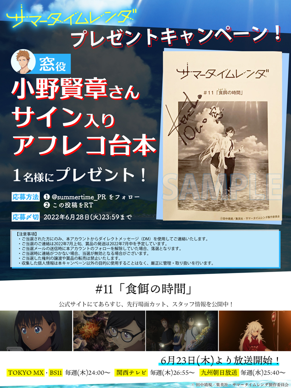 第11話“食餌の時間”の放送直前を記念して、プレゼントキャンペーンがスタート。作品公式Twitterをフォロー&キャンペーンツイートをRTしていただいた方の中から抽選で1名に“菱形窓役・小野賢章さんサイン入り#11 アフレコ台本”をプレゼントいたします。