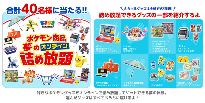 “ポケモン商品 夢のオンライン詰め放題にどんな商品があるのか見たい!”、“オンライン詰め放題を体験したい!”そんなキミに! <ポケモン商品 夢のオンライン詰め放題>のお試し体験として、“ポケモン選べるなつやすみプレゼント”を開催中!