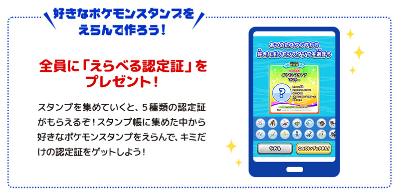 さらに、集めたスタンプ数に応じて“認定証”を全員にプレゼント。スタンプ帳に集めた中から好きなポケモンスタンプを選んで、キミだけの認定証をゲットしよう! 認定証は全部で5種類。