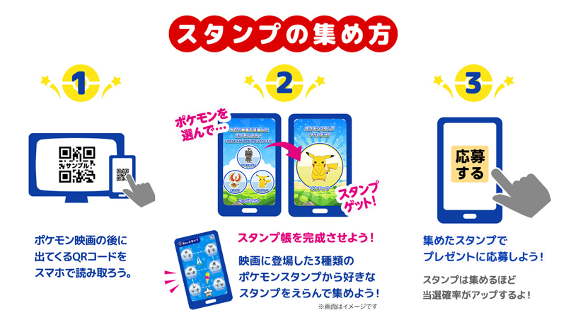 2:映画に登場した3種類のポケモンスタンプから好きなスタンプを選んで集めよう! キミだけのスタンプ帳が完成するよ! ぜんぶ集めると23コ!