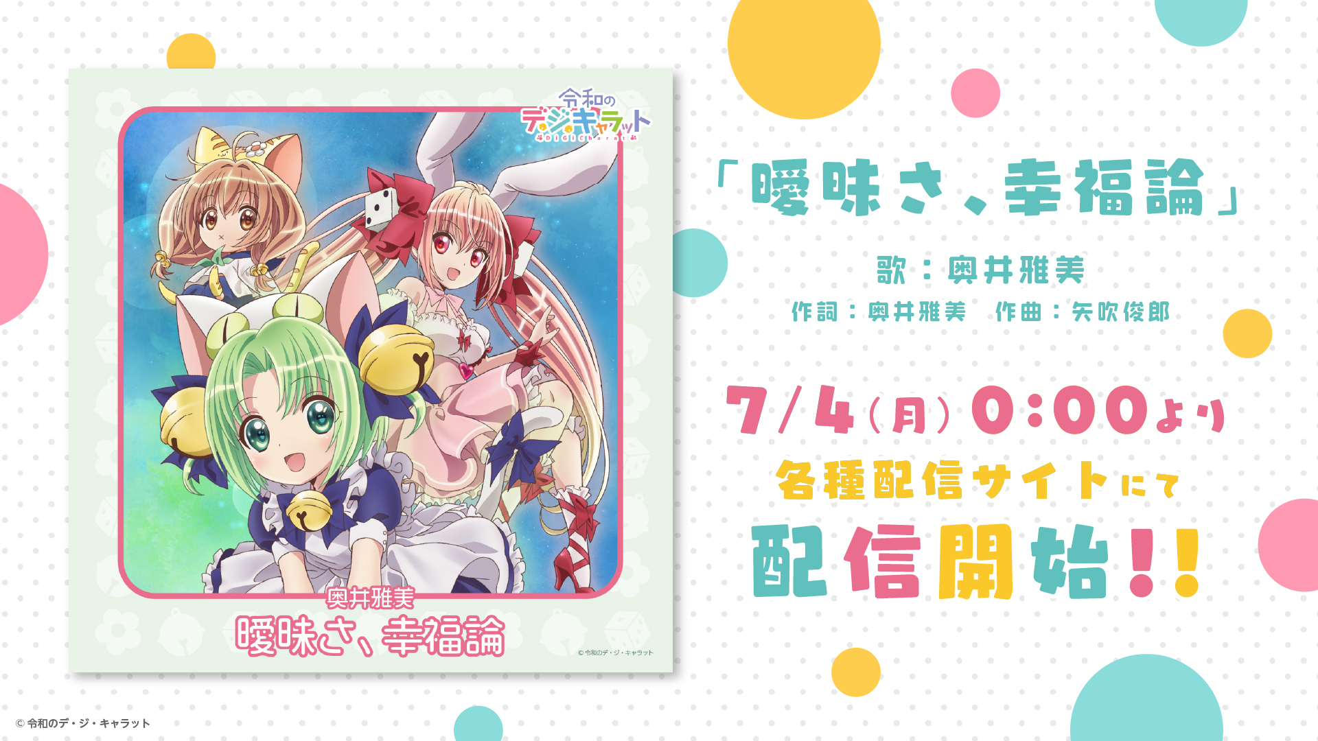 『令和のデ・ジ・キャラット』主題歌、『曖昧さ、幸福論』が7月4日0:00より配信されます。歌っていただくのはもちろん、歴代のアニメシリーズでも主題歌を担当して頂いた奥井雅美さん。