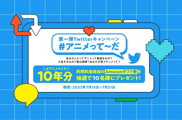 アニメに対する想い “#アニメって~だ”を募集し、Twitterキャンペーンに参加いただいた方の中から抽選で10名さまに、“dアニメストア”10年分料金相当のAmazonギフトをプレゼントするTwitterキャンペーンを開催いたします。詳細は“dアニメストア”10周年記念特設サイトにて公開いたします。