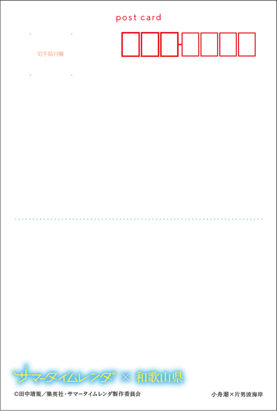 本フレーム切手を郵便局の窓口でご購入いただいたお客さまに限り、1シートにつき1枚、“サマータイムレンダ×和歌山県”のオリジナルポストカードをお渡しします(郵便局のネットショップおよびコミックマーケット100でのご購入は除く)。