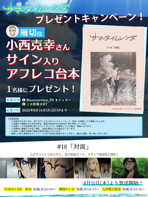 第18話“対面”の放送直前を記念して、プレゼントキャンペーンがスタート。作品公式Twitterをフォロー&キャンペーンツイートをRTしていただいた方の中から抽選で1名に“雁切役・小西克幸さんサイン入り#18 アフレコ台本”をプレゼントいたします。