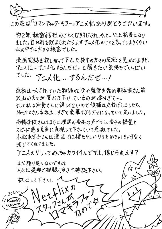 この度は『ロマンティック・キラー』アニメ化ありがとうございます。約2年、秘密結社のごとく口封じをされ、やっと……やっと発表になりました。