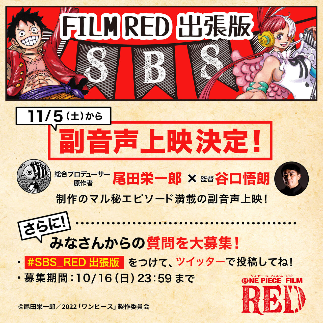 映画『ONE PIECE FILM RED』について、原作者・尾田栄一郎さん×監督・谷口悟郎さんによる“FILM RED 出張版 SBS《副音声上映》”の実施が決定しました。