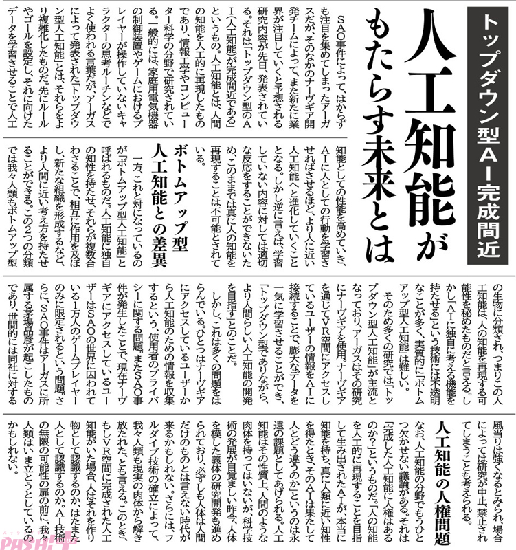 人工知能の開発や種別、人権問題についての考察が掲載されており、アインクラッド編のユイの存在やアリシゼーション編のアリスの存在の伏線となる記事となっています。