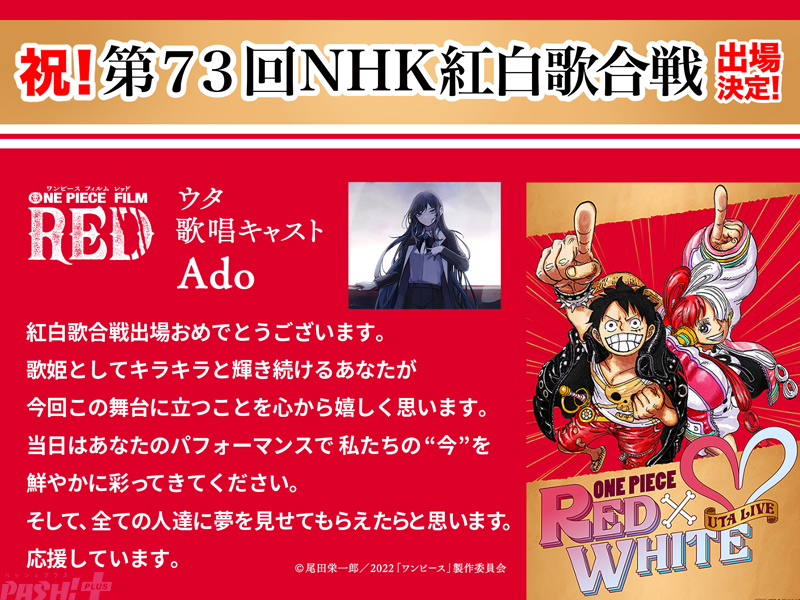 映画『ONE PIECE FILM RED』に登場するウタが“第73回 NHK 紅白歌合戦”に“紅組出場歌手”として出場決定! さらに、番組とのコラボレーション企画“ONE PIECE UTA LIVE RED×WHITE”も発表されました。